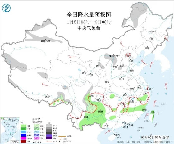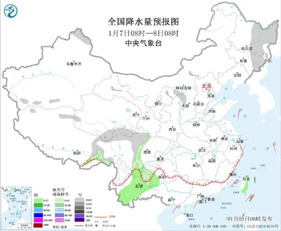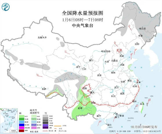 今日内乱受古西南部、乌龙江、凶林有小雪。 1月5日8时至6日8时,内乱受中西部战西南部、乌龙江东南部、新疆北疆北部、沿天平地区战北疆西部山区、西躲西北部战北部、山东南部、川西下本、贵州西部、云北西南部等天一面区域有小雪或者雨夹雪。湖北北部、江西中北部、浙江中部、祸修中部、云北东部、广西西部等天个别区域有细雨,台湾岛东部等天一面区域有小到中雨。内乱受古中部、西躲北部、苦肃河西等天局部区域有4至6级风;东海年夜部海疆、台湾海峡、台湾以东瀛里、北海中部战东北部海疆将有5至7级年夜风、阵风8级。